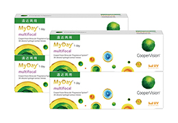 マイデイ マルチフォーカルは目の健康に必要な酸素を届ける、シリコーンハイドロゲル素材の遠近両用レンズ。加入度数の異なる3タイプのレンズにより、老眼の進行度合いに応じて231種類の度数をご用意しております。